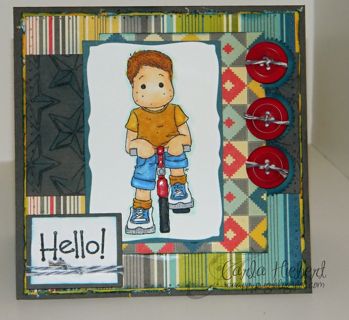 Hello everyone!  Do you have a hard time making cards for men or boys?  If so, this is a perfect chance to practice doing just that by joining in our Challenge: anything boy/masculine related or colors (reds, blue, navy, brown, etc)!  So put your thinking cap on and dig thru your stash and see what you can come up with and play along!
